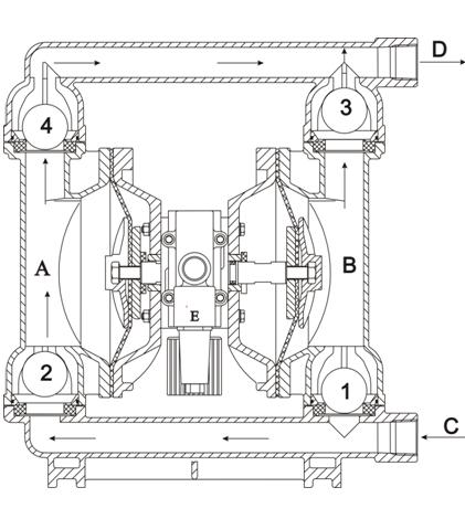 在图1示中压缩空气由(E)进入配气阀,使膜片向右运动,则(A)室的吸力使介质由(C)入口流入,推开球阀(2)进入(A)室,球阀(4)则因吸入而闭锁。同时球阀(1)闭锁,防止回流,就这样循环往复使介质不断从(C)入口吸入,(D)口排出。